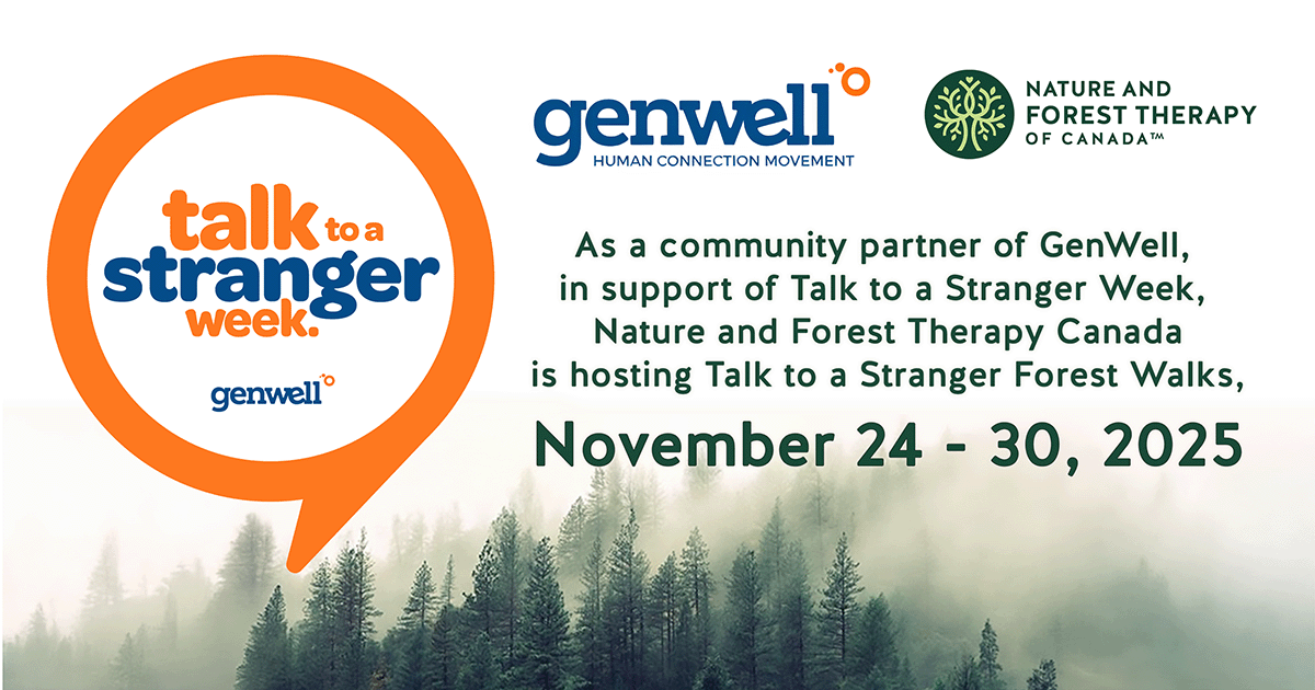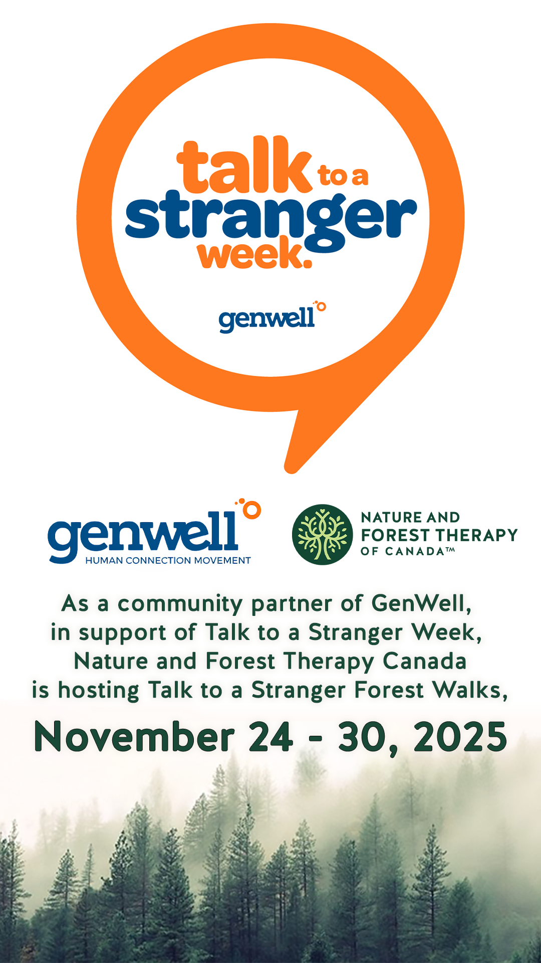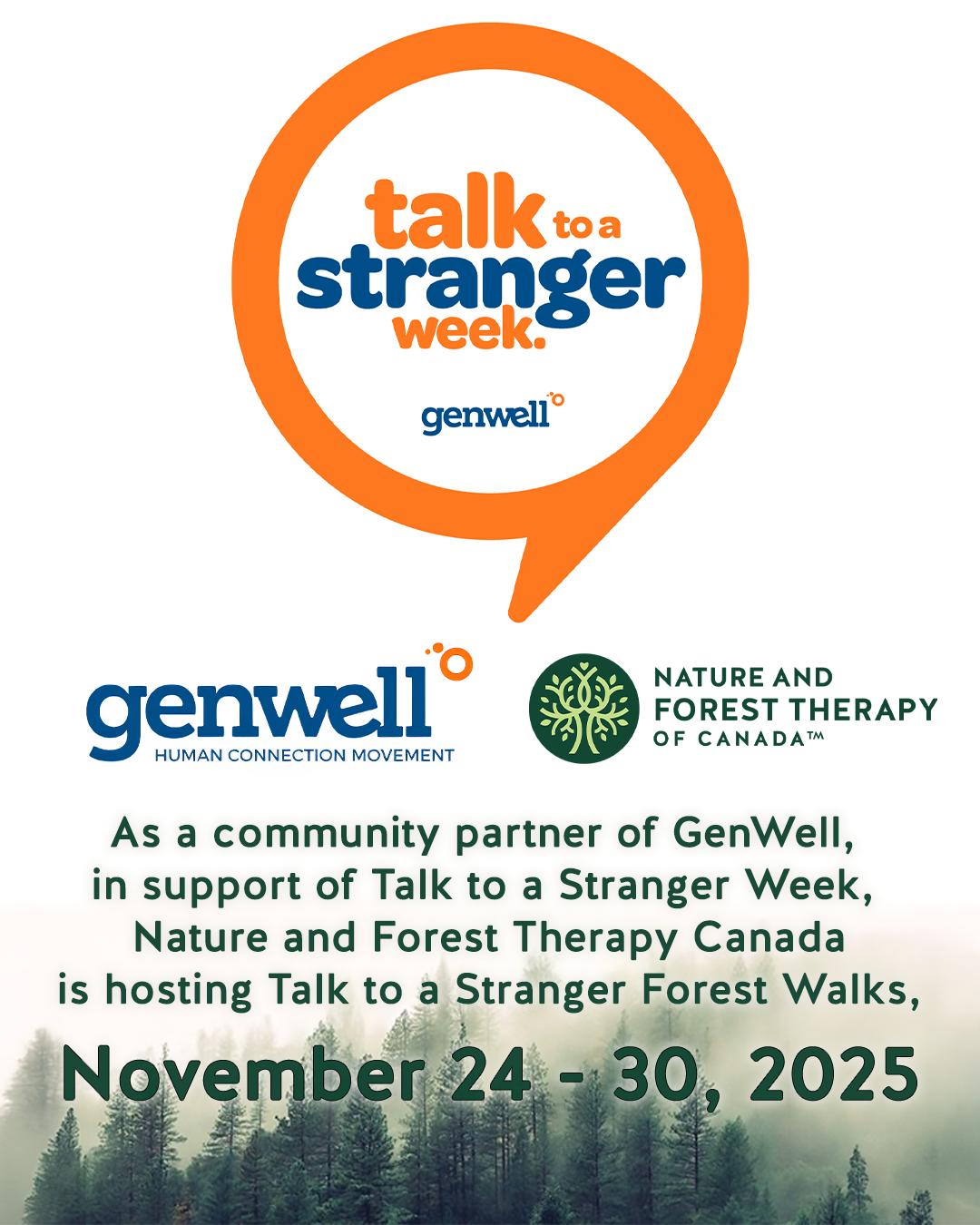 For the first time in November 2025, NFTC/SINC is partnering with another organization, GenWell, in a campaign that can help raise awareness around guided forest therapy walks. As a community partner of GenWell, in support of Talk to a Stranger Week, NFTC/SINC Certified Forest Therapy Guide Members are hosting Talk to a Stranger Forest Walks. Here is some background information about the campaign and the partnership.